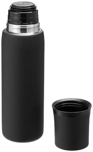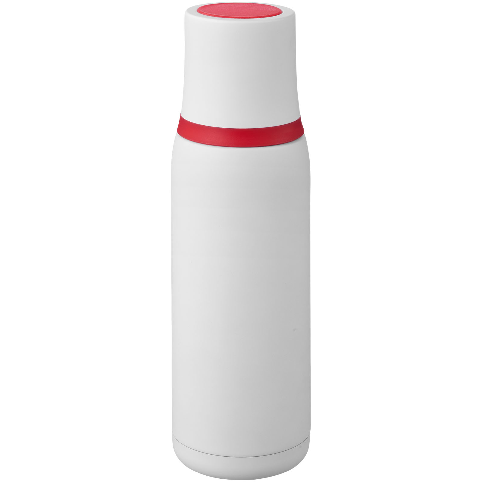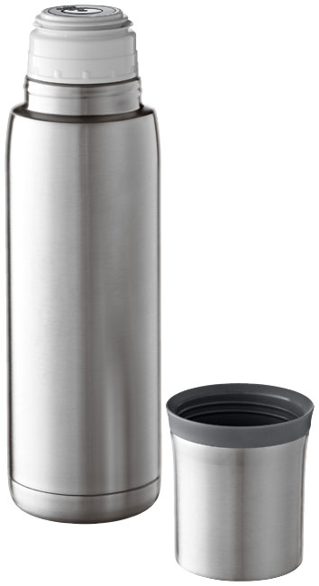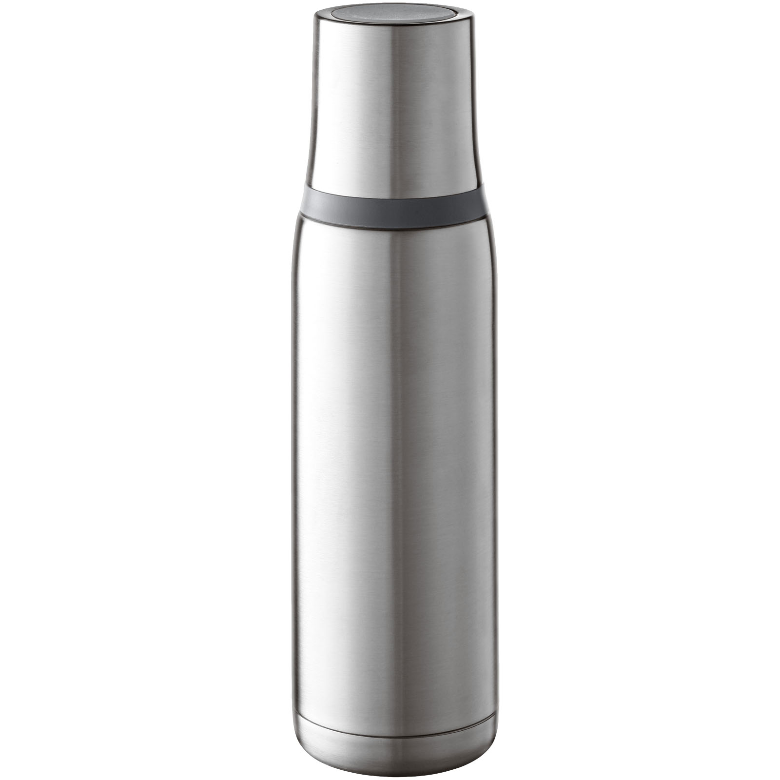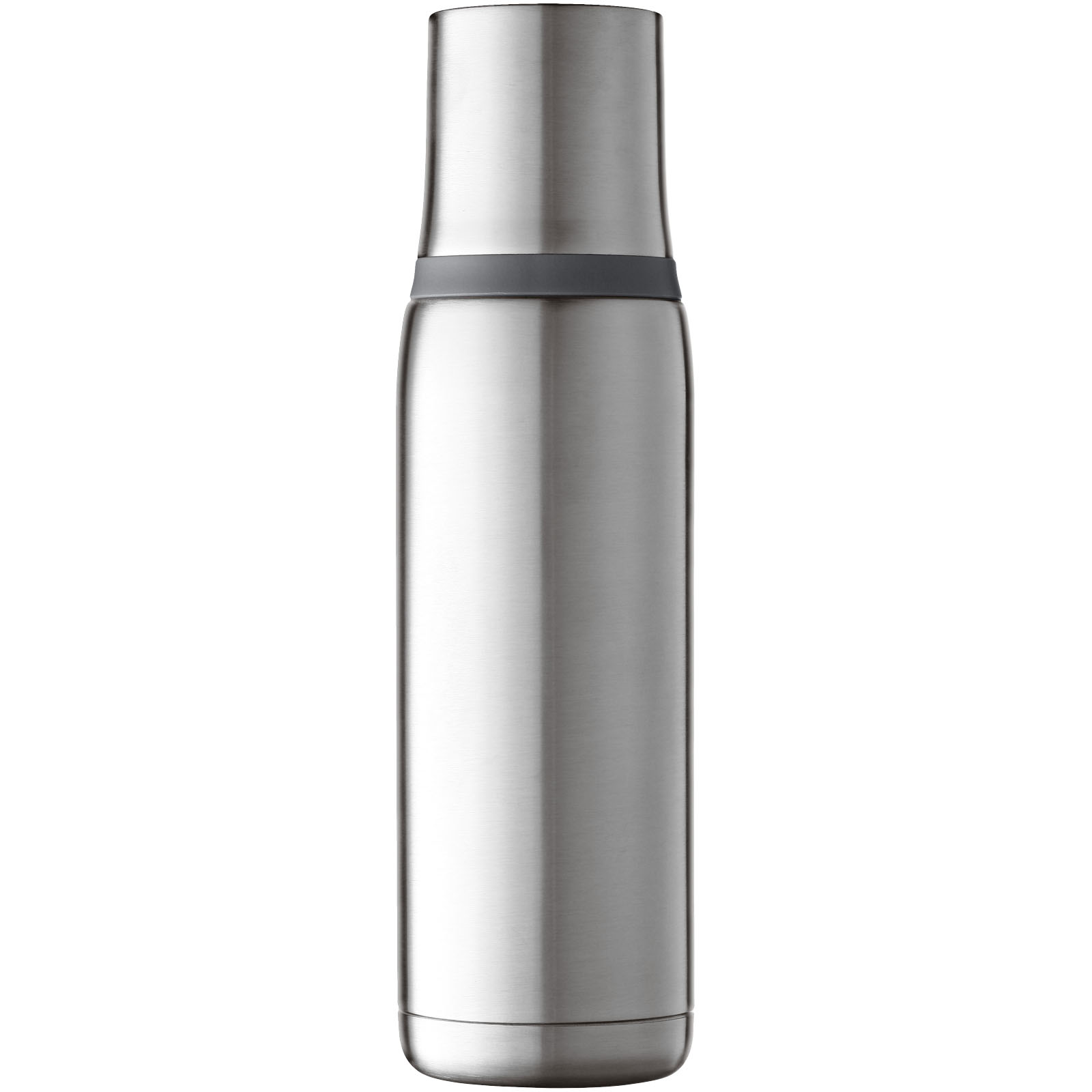 Termoska vákuová Flow. Termoska Flow má dvojitý plášť vyplnený penou a vákuovú izoláciu. Táto izolácia zaistí najdlhšie uchovanie teploty. Je vybavená nalievacím tlačidlom ovládaným jednou rukou a zabudovaným šálkou v uzávere. Vršok šálky a dno majú protišmykové silikónové podložky. Objem 500 ml. Dodávané v darčekovej kazete. Exkluzívny dizajn. Zvonka i vo vnútri nerezová oceľ.