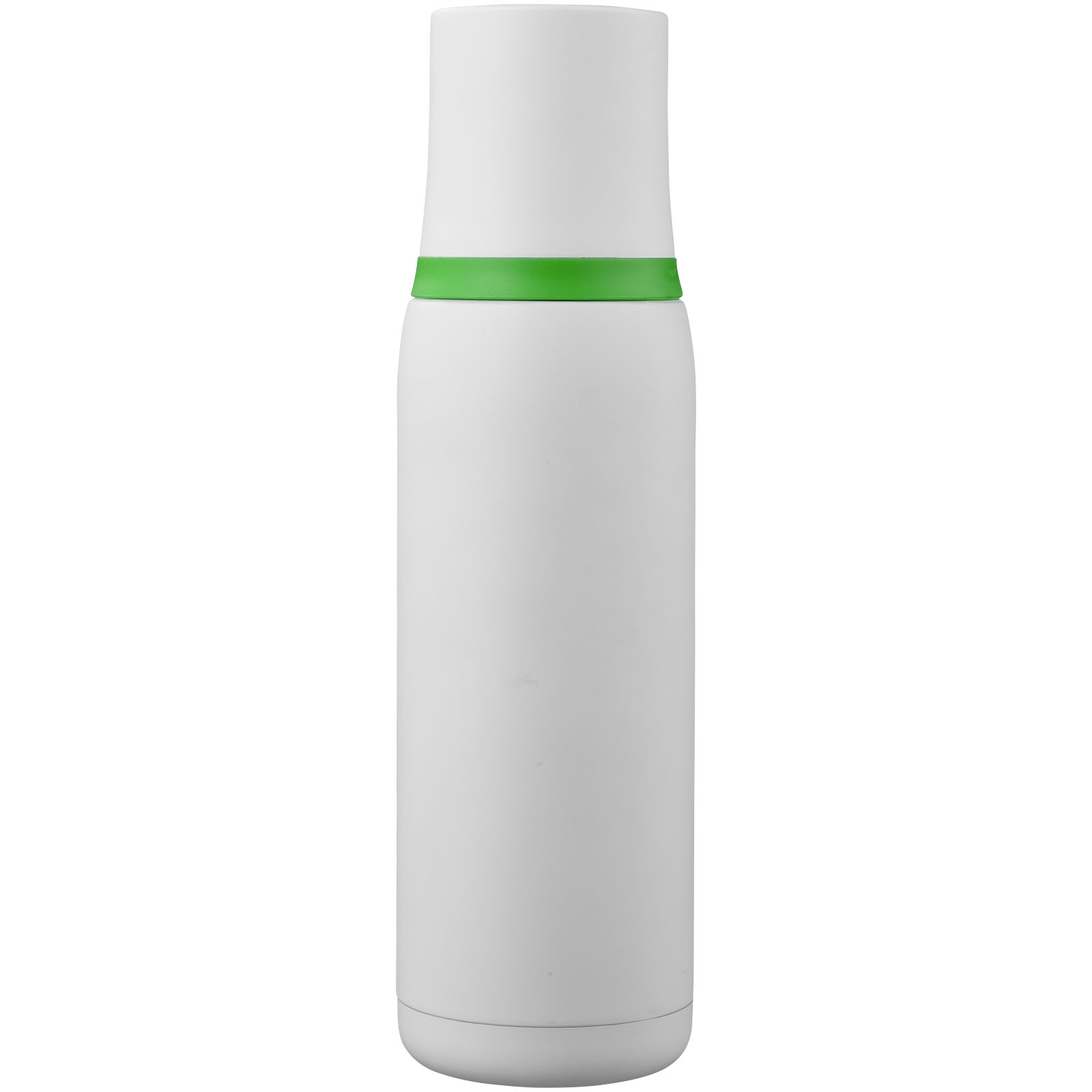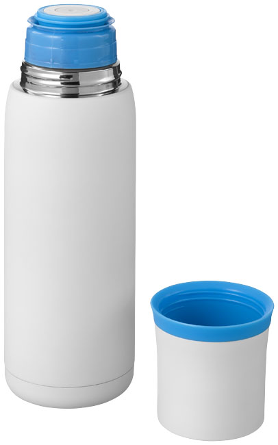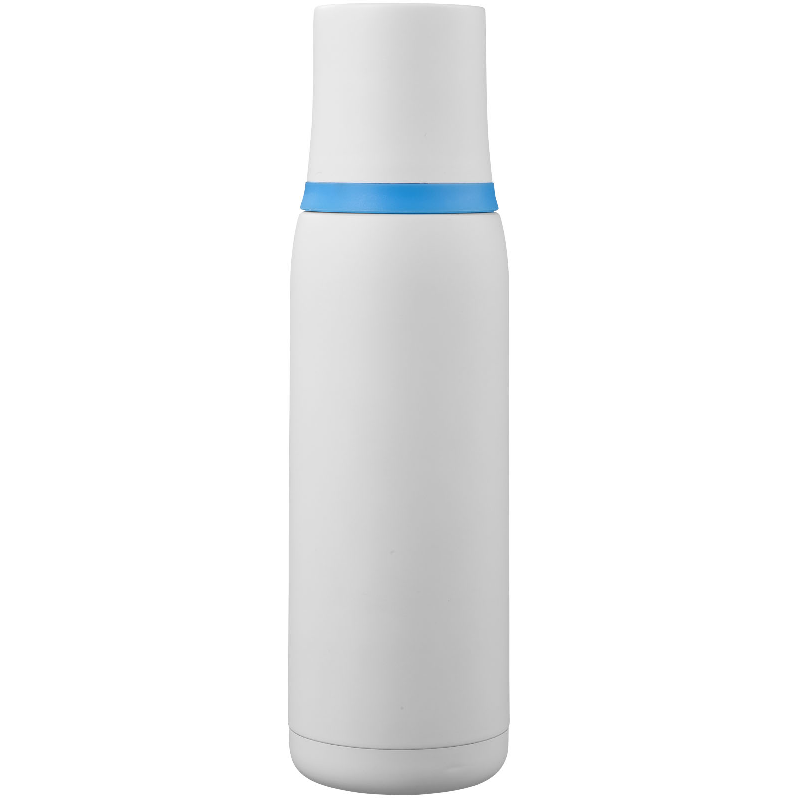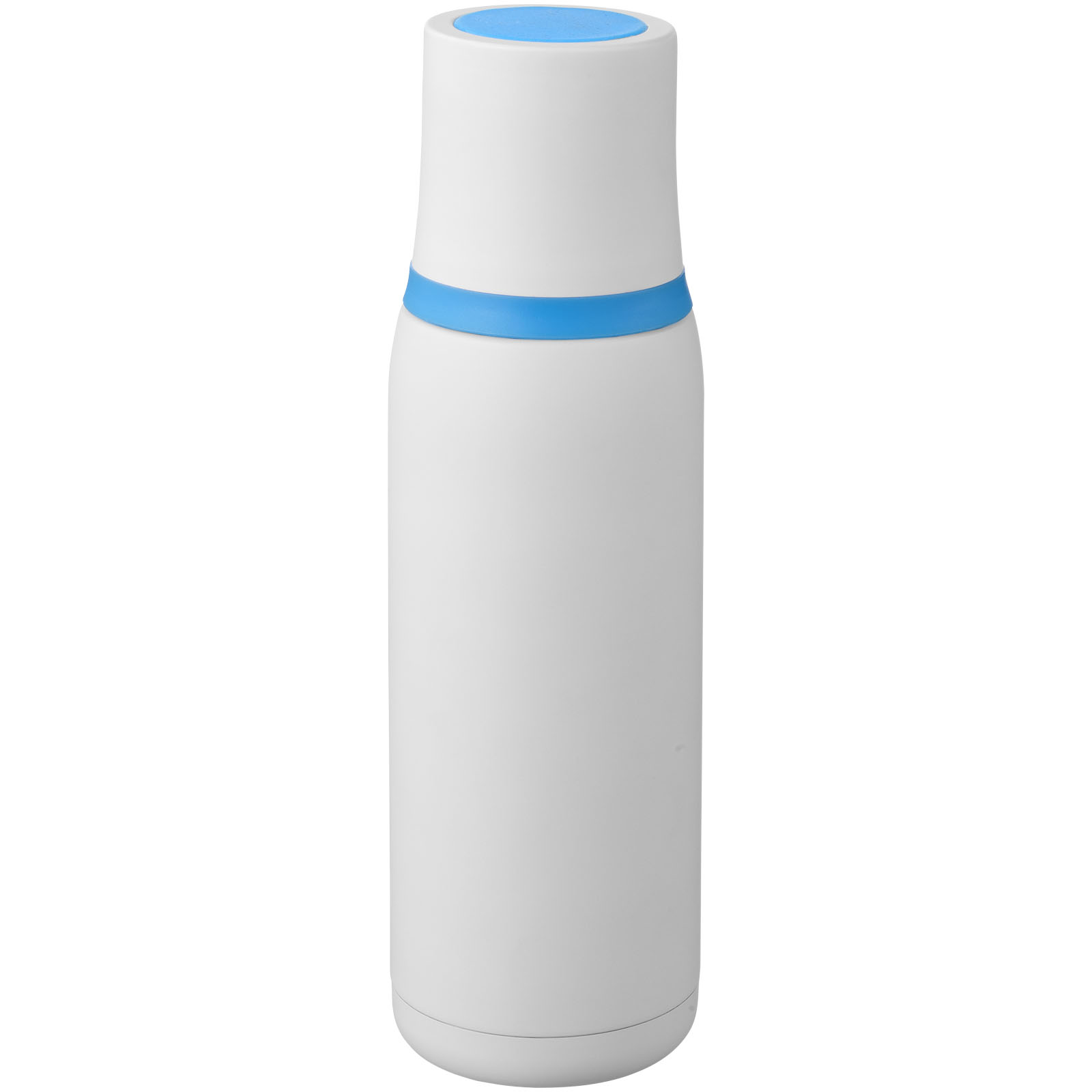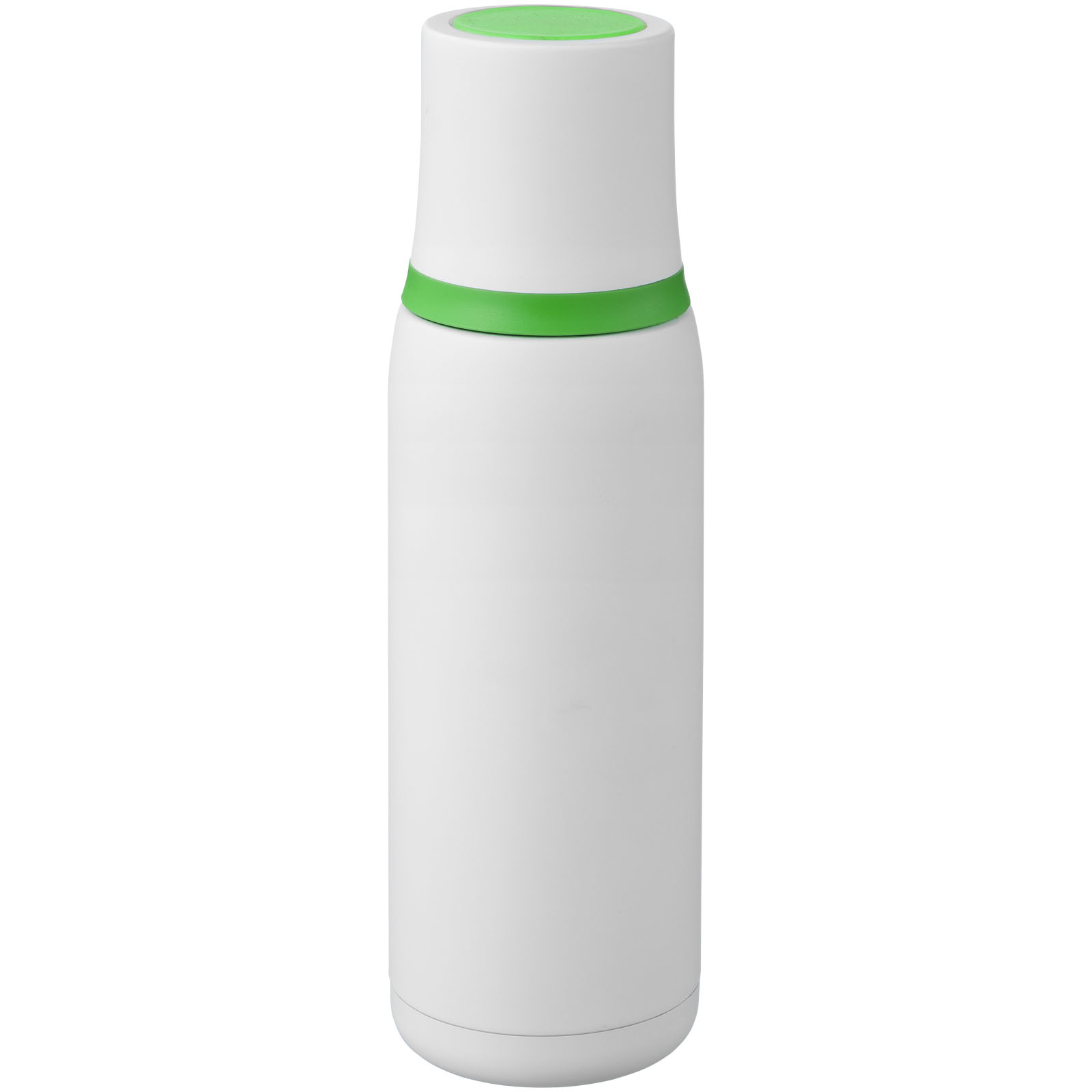 Termoska vákuová Flow. Termoska Flow má dvojitý plášť vyplnený penou a vákuovú izoláciu. Táto izolácia zaistí najdlhšie uchovanie teploty. Je vybavená nalievacím tlačidlom ovládaným jednou rukou a zabudovaným šálkou v uzávere. Vršok šálky a dno majú protišmykové silikónové podložky. Objem 500 ml. Dodávané v darčekovej kazete. Exkluzívny dizajn. Zvonka i vo vnútri nerezová oceľ.