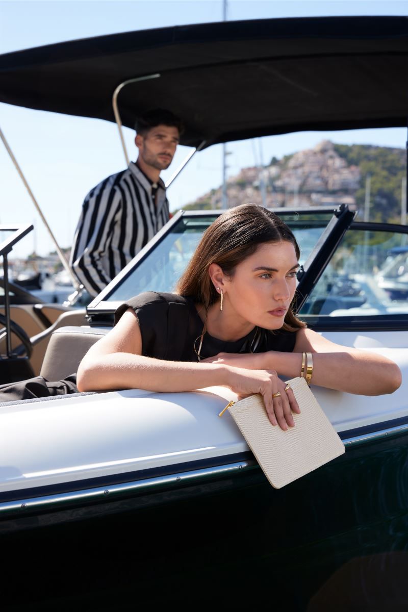 Zips z vysoko lesklého kovu zlatej farby, hlavná priehradka na zips, penové polstrovanie, štruktúrovaná tkanina, štítok TearAway, objem 0,5 l, rozmery: 26x17cm, čistiť hubkou.