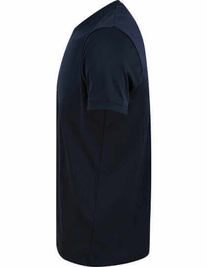 100% polyester interlok HiCool® | Priadza HiCool® | Technológia trvalého odvádzania vlhkosti | Okrúhly výstrih z rovnakej tkaniny | Manžety z rovnakej tkaniny | Úzky strih | Odstrihnuteľný štítok Henbury a štítok s veľkosťou | Vhodné pre sublimačnú tlač