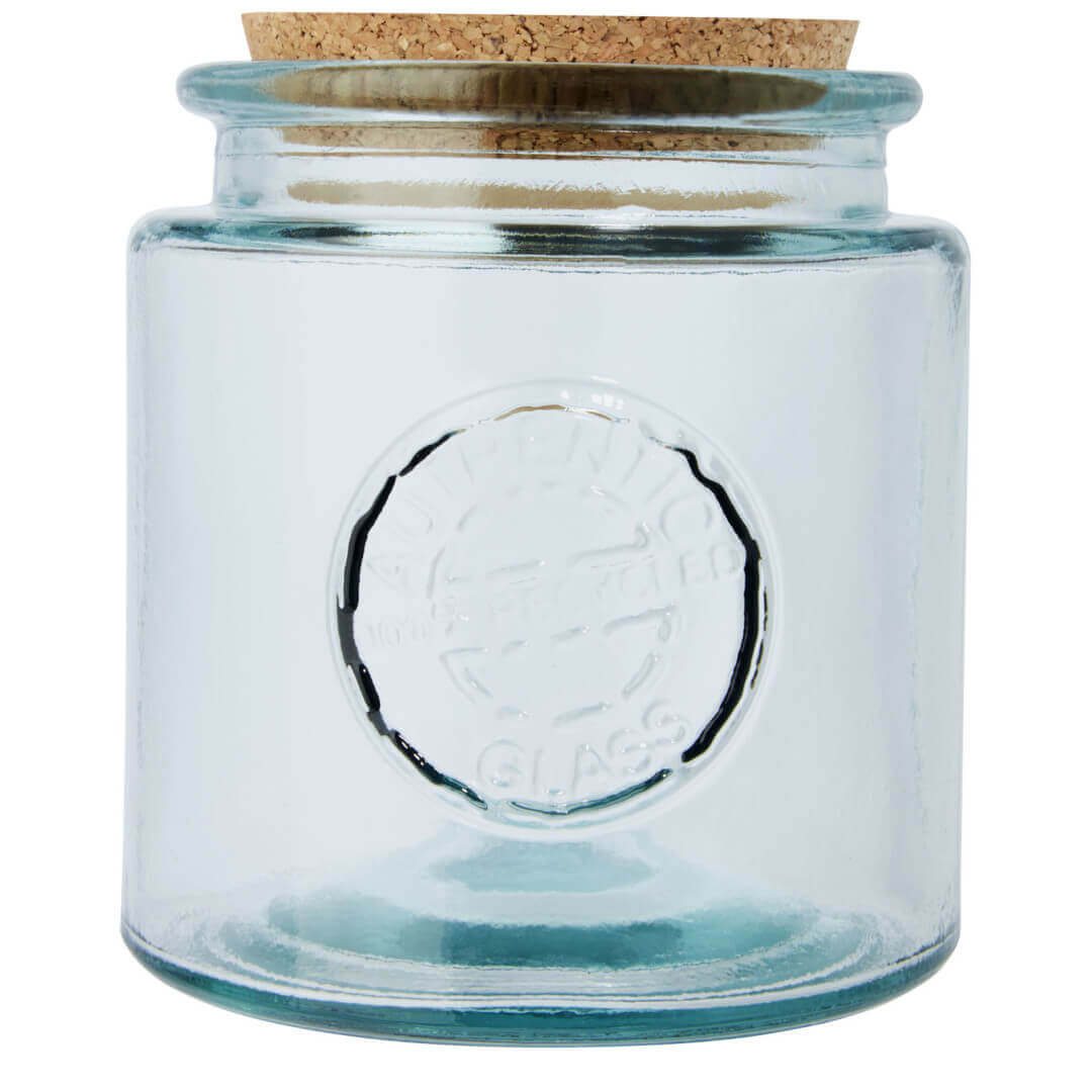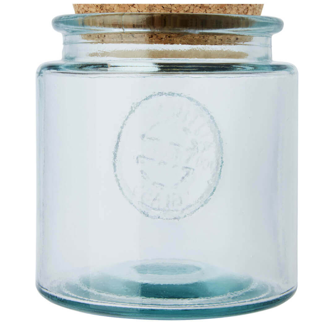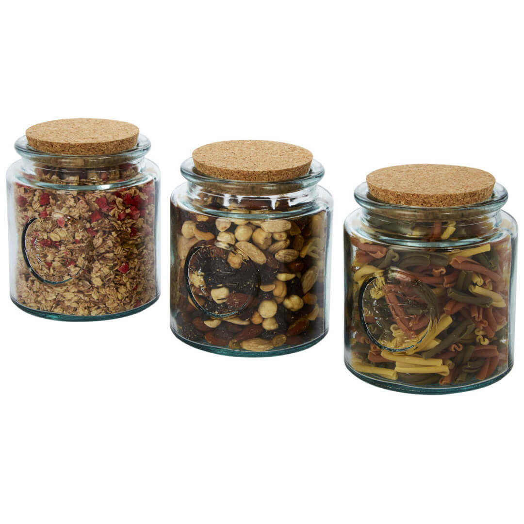Súprava s tromi nádobami z recyklovaného skla s objemom 800 ml s korkovým vekom. Vyrobené z 3 sklenených fliaš. Recyklované sklo sa vyrába s použitím menšieho množstva energie, surovín a aditív, než je nutné na výrobu tradičného skla. Veľkosť nádob: výška 13 cm, priemer 12 cm.