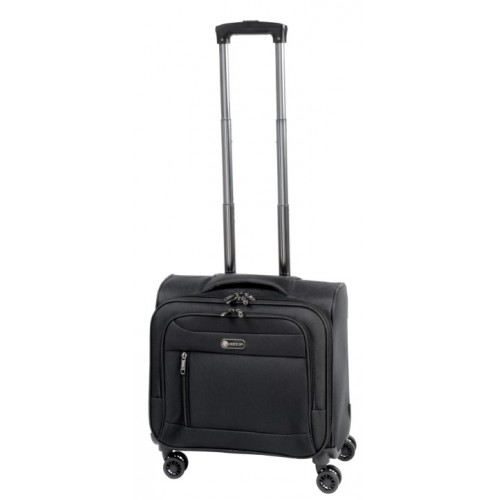 2 predné vrecká na zips a vymeniteľné logo CHECK.IN, jedna z predných vreciek má sieťované vrecko na zips a organizér, hlavný priestor s baliacim popruhom a čalúnená priehradka na laptop (so suchým zipsom) ), pohodlná a zosilnená rukoväť na nosenie, uzamykateľný teleskopický vozík, 4 hladko bežiace dvojité otočné kolesá, s integrovaným štítkom s adresou