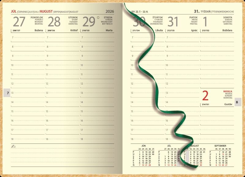Certifikovaný týždenný diár s prehľadným slovenským kalendáriom na každý týždeň. Na obal je použitý vysokokvalitný papier NAPURA s prírodným dizajnom, 100 % recyklovateľný, s lacetkou. Vďaka vysokej kvalite vlákien je možná: termorazba, razba fóliou alebo ÚV tlač.