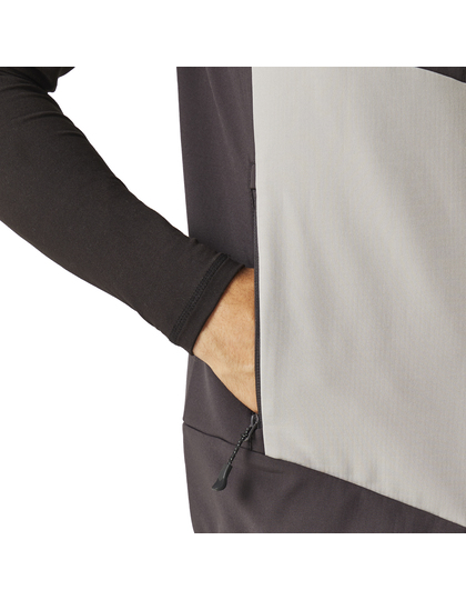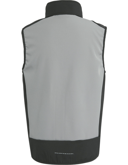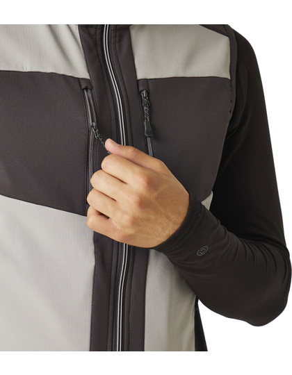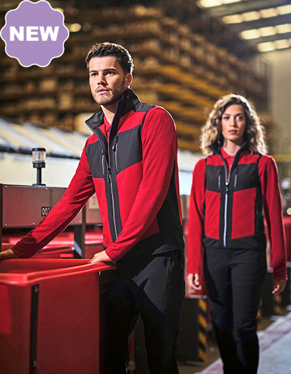 Tkaný strečový softshellový materiál s hrejivou vrstvou. Tkanina s ochranou proti vetru a vode. Pružné lemovanie na prieramkoch, leme a golieri. 2 spodné vrecká na zips a 2 náprsné vrecká na zips s vnútorným chráničom zipsu. Reflexný natlačený detail. Na hrudi miesto na dekoráciu. Vyrobené z recyklovaných materiálov.