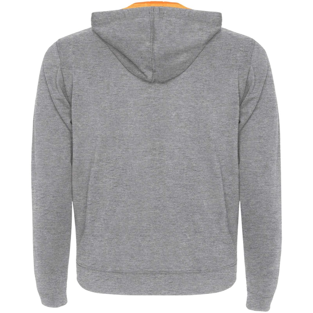 Mikina z nečesaného fleecu so žiarivo farebnými detailmi. Stredový zips s kontrastným tiahlom. Kapucňa s podšívkou z mikroperforovanej polyesterovej látky v kontrastnej žiarivej farbe. Sťahovacia šnúrka a kovové očká v kontrastnej žiarivej farbe. 1 × 1 rebrované manžety a pás. Dve predné vrecká so širokým lemom. Zosilnené kryté švy na vnútornom golieri. Odnímateľný štítok. 60% bavlna, 40% polyester, 280 g/m2.