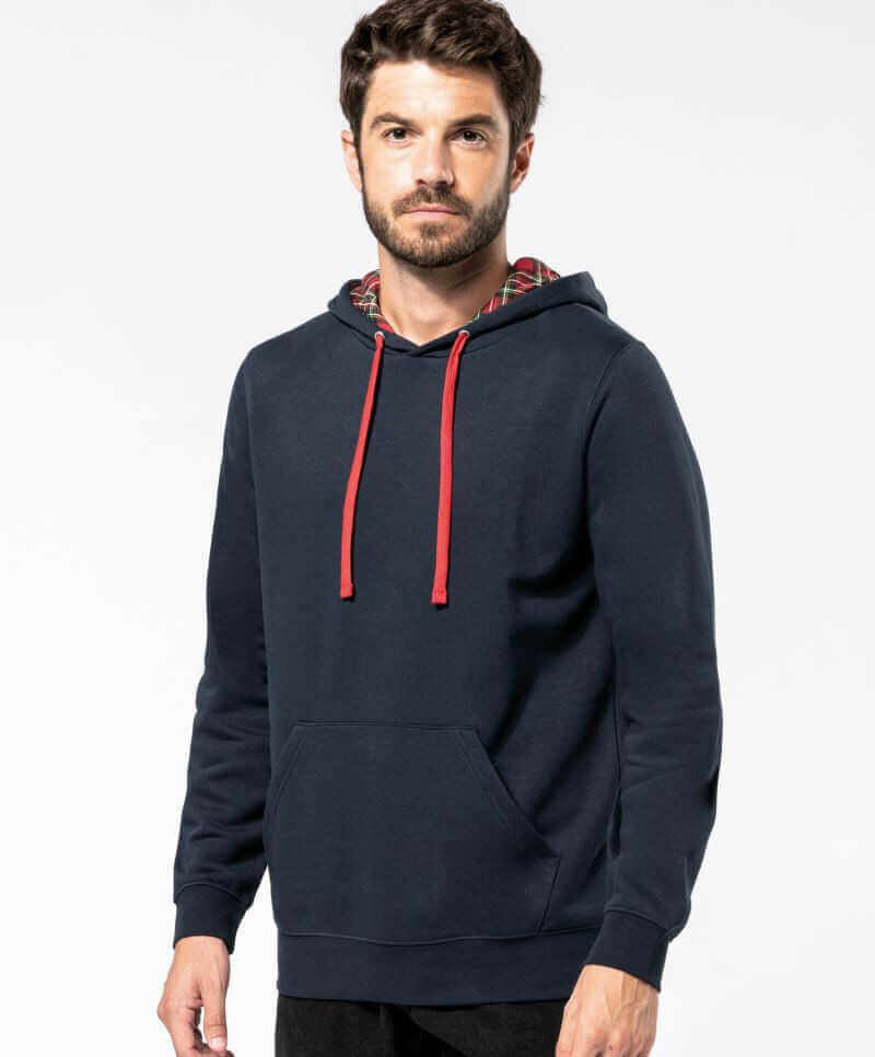 Materiál: 280 g/m², 80 % česaná bavlna, 20 % polyester, kapucňa: bavlnený džersej. Mikina úzkeho strihu, podšitá kapucňa v kontrastnej farbe so šnúrkou, polmesiac v krku, rebrované manžety na rukávoch a leme, klokanie vrecko, 3-vláknový česaný fleece, štítok TearAway.