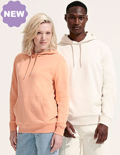 Česaná organická bavlna od pestovateľov prechádzajúcich na organickú výrobu. Recyklovaný polyester. Postranné švy. Vsadené rukávy. 2 x 2 rebrované manžety a spodná časť. Vrecko klokanka. Spevňovacia páska za krkom vo vnútri goliera. Kapucňa lemovaná džersejom. Sťahovacia šnúrka s kovovými očkami a zarážkami. Nečesaná vnútorná strana.