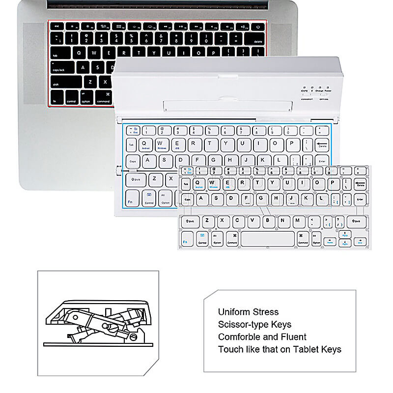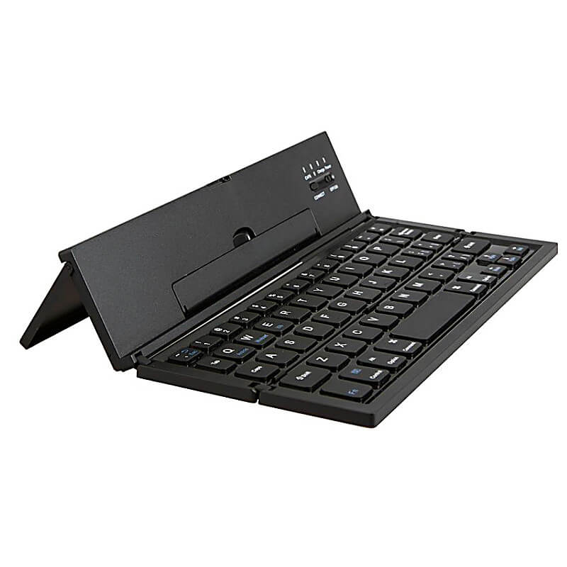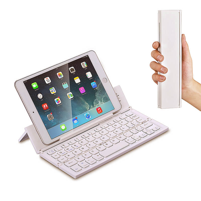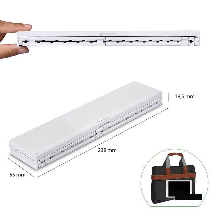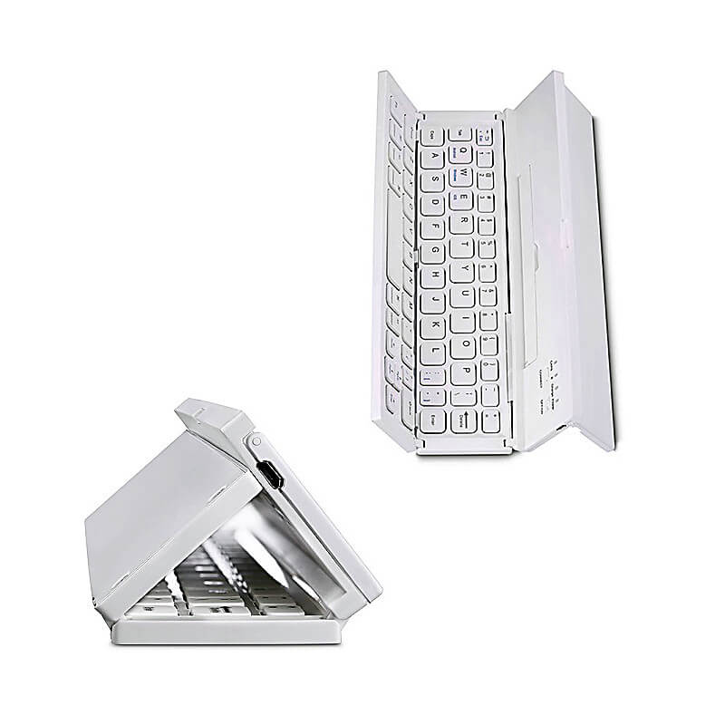 Univerzálna skladacia Bluetooth klávesnica je ideálna pre pripojenie k tabletu či mobilného telefónu. Tenkú klávesnicu pripojíte k svojmu zariadeniu pomocou technológie Bluetooth je kompatibilný s iOS, Androidom aj Windows. Dosah pripojenia je až 10 metrov. Praktickým zložením získate malú pomôcku pre kancelársku prácu, ktorá sa zmestí do príručnej batožiny. Po rozložení sa dá klávesnica príjemne využívať vďaka vzniknutému stojanu na opretie mobilného zariadenia. Skladacia Bluetooth klávesnica je vyrobená z plastu. Zvoliť si môžete z rôznych farieb a k dispozícii je možnosť potlače.