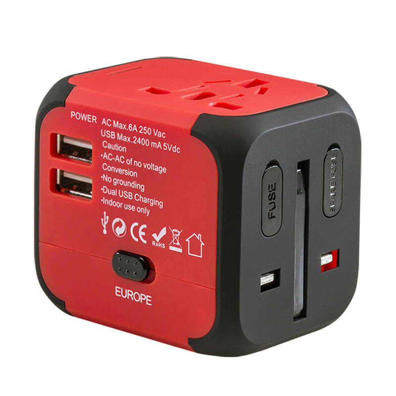 Milovníci cestovania určite ocenia premyslený univerzálny cestovný adaptér rovno s 2 USB výstupmi. Malá krabička poslúži ako adaptér pre zásuvku v Austrálii, Číne, USA, UK aj Európe. Na nabíjanie mobilného zariadenia využijete dva USB výstupy. Cestovný adaptér je vyrobený z pogumovaného plastu, je dostupný v rôznych farebných variantoch a môže byť opatrený potlačou podľa vášho priania.