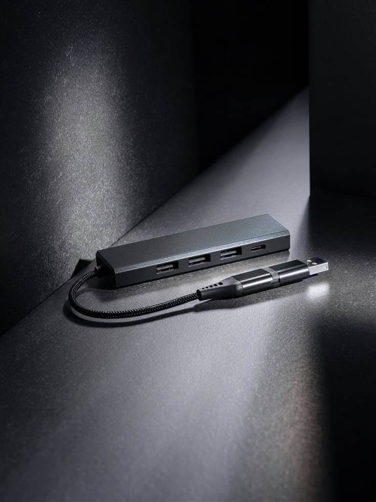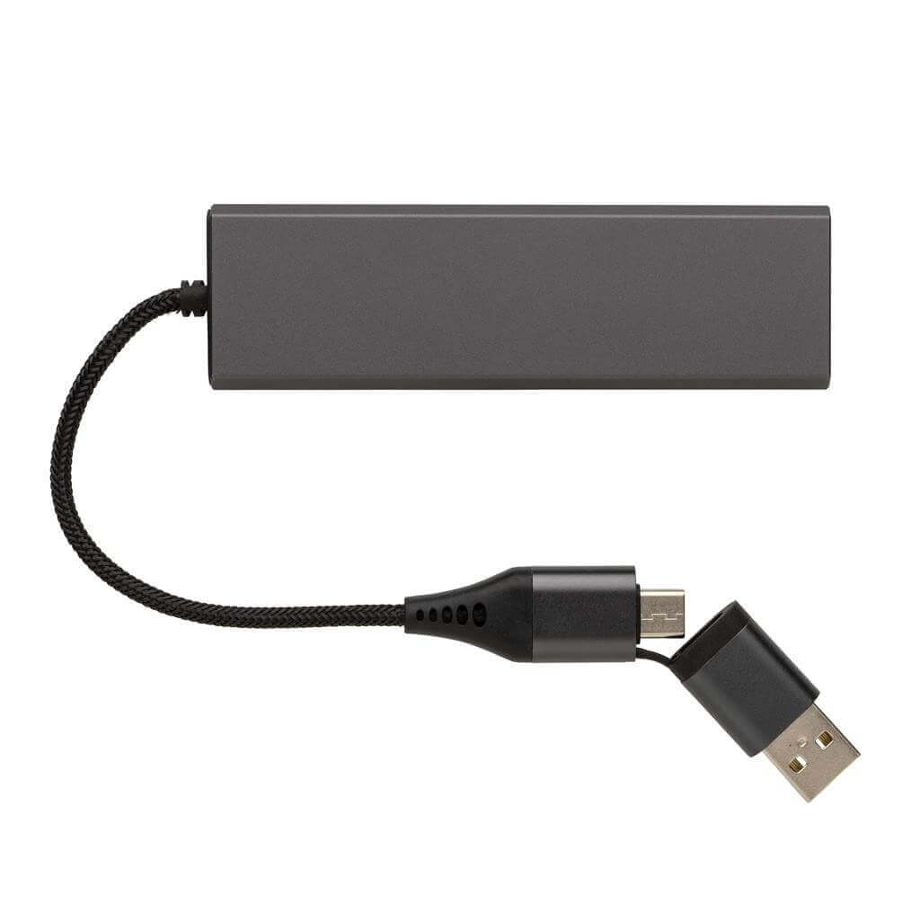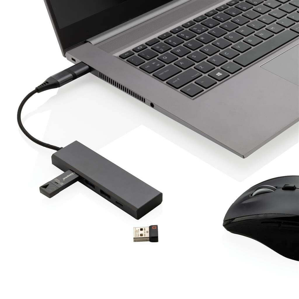 USB rozbočovač s 3 USB A 2.0 a 1 USB C portami. Vyrobený z recyklovaného hliníka, ABS, TPE a PET s RCS certifikáciou. RCS (Recycled Claim Standard) je globálny štandard, ktorý umožňuje overiť použitie recyklovaného materiálu v produkte naprieč celým dodávateľským reťazcom. Celkový podiel recyklátu podľa váhy produktu: 75 %. Hliník pri recyklácii nijako nestráca svoje vlastnosti, možno ho teda opakovane recyklovať. Integrovaný 10 cm kábel z RCS TPE/PET s duálnym konektorom USB A/USB C. Balené v FSC® darčekovej krabičke. Výrobok je kompletne bez PVC.