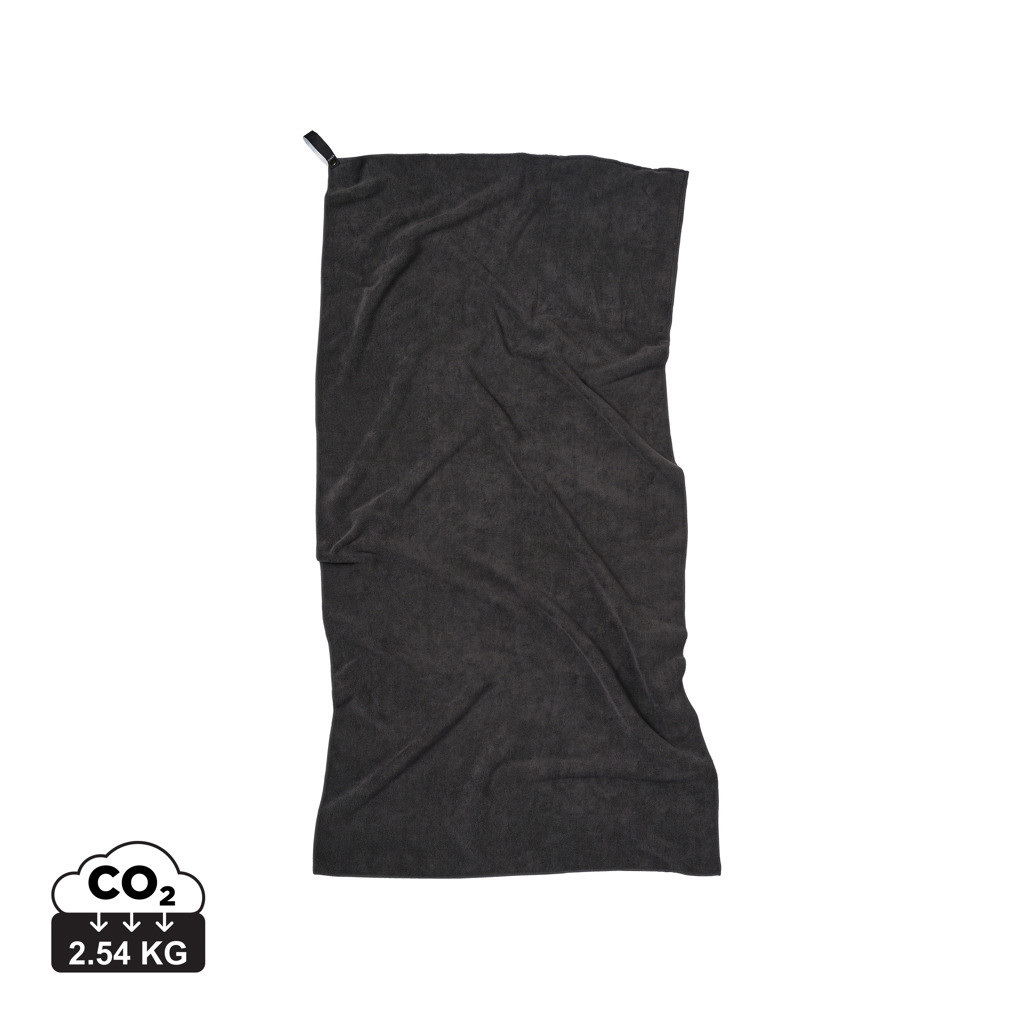Vyrobený z mikrovlákna a čiastočne z recyklovaných PET fliaš. Ľahký a kompaktný. Jedinečná štruktúra froté tkaniny dokáže absorbovať viac vody a schne trikrát rýchlejšie ako tradičný uterák. Ideálne pre outdoorové aktivity, šport a cestovanie. Táto veľkosť je vynikajúca na použitie v telocvični. Na výrobu tohto uteráka boli použité tri recyklované PET fľaše.