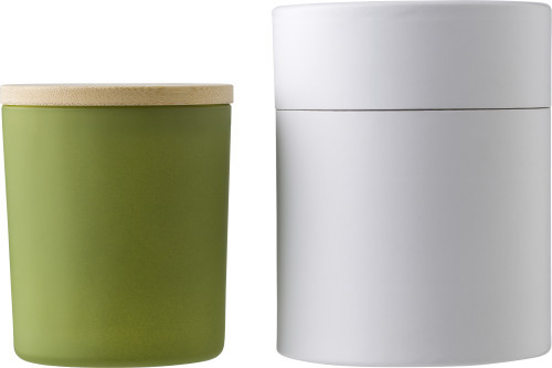 Pohár so sviečkou z rastlinného vosku s bambusovým viečkom. Sviečka obsahuje prevažne rastlinný vosk (karnaubský vosk) a jej doba horenia je cca 46 hodín. Vôňa sviečky sa rozlišuje podľa jej farby. Červená = škorica, biela = vanilka, čierna = santalové drevo, zelená = jazmín. Každý kus je balený v bielej tube.
