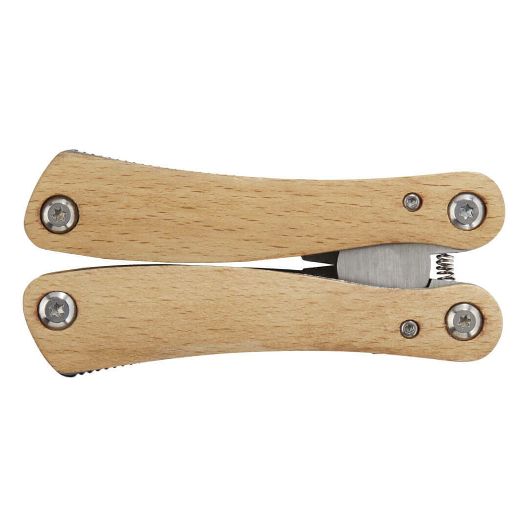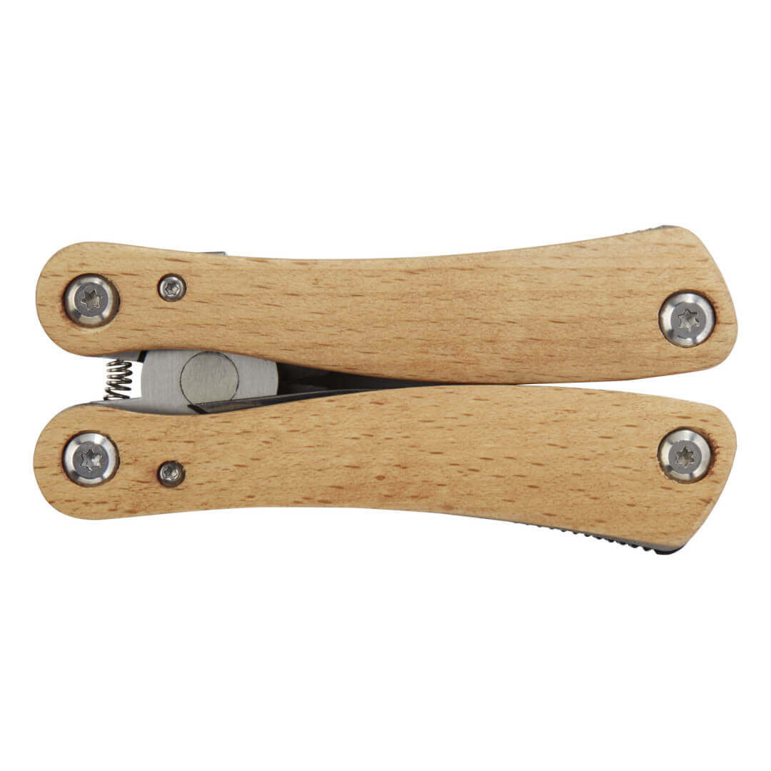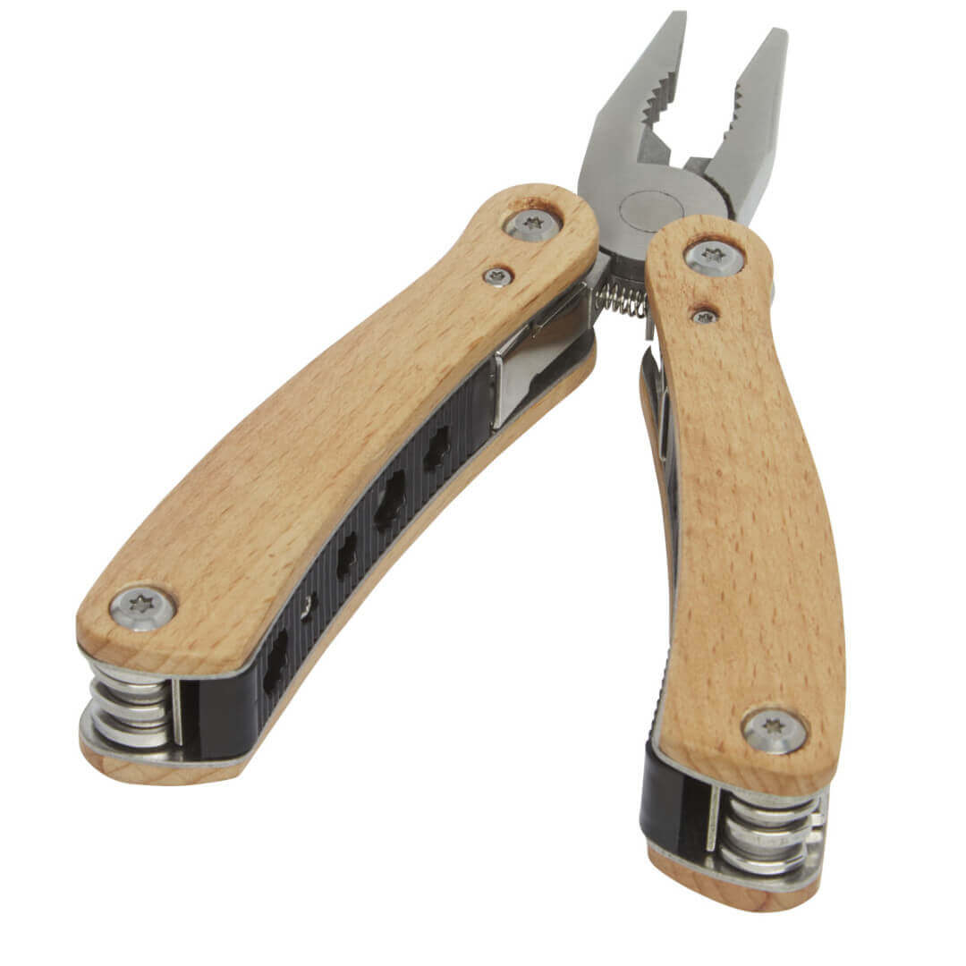 Pevný a odolný veľký multifunkčný nástroj vyrobený z vysoko kvalitnej nerezovej ocele s rukoväťou z bukového dreva. Toto je nevyhnutný nástroj pre každého skauta, domácich majstrov a outdoorového nadšenca. Obsahuje 12 funkcií: veľké rovné kliešte, štandardné kliešte, štiepacie kliešte, zúbkovaná čepeľ, stredne veľký nôž, skrutkovač Philips, otvárač na fľaše/konzervy, plochý skrutkovač, stredne veľký plochý skrutkovač, pílka, pilník a čistič na pilník. Použité bukové drevo pochádza z udržateľných, ekologicky a sociálne zodpovedných zdrojov. Veľkosť pri otvorení je 15 x 6,5 cm a pri zatvorení 9,8 x 4,7 cm. Dodáva sa s návodom na použitie a je zabalený v darčekovej krabičke z recyklovanej lepenky o veľkosti 12 x 7 x 2,5 cm. Laserové gravírovanie sa odporúča ako možnosť udržateľnej dekorácie.