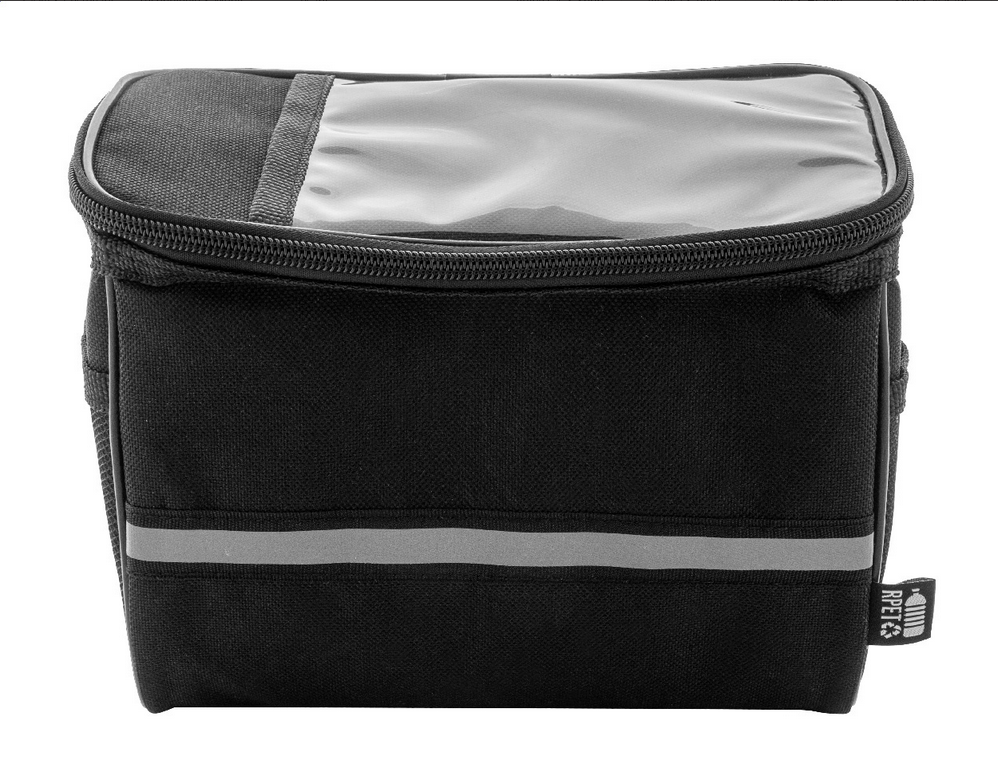 Taška na riadidlá bicykla z RPET s priehradkou na zips, vreckom na mobil s dotykovou obrazovkou, bočnými sieťovanými vreckami, nastaviteľnými popruhmi na suchý zips a reflexným prúžkom. Polyester 600D RPET s výrazným štítkom RPET. Nosnosť tašky: 2 kg. Objem tašky: 4 l