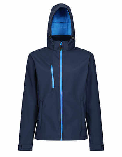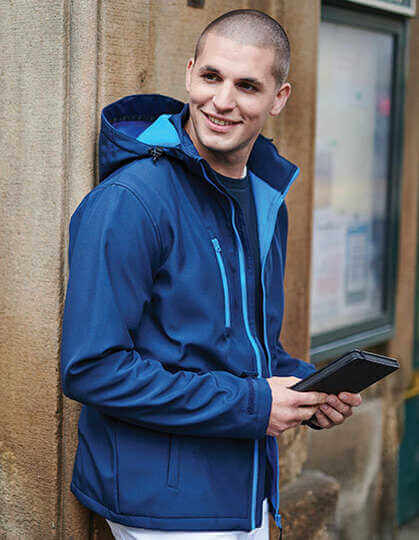 Mäkký tkaný softshell XPT s hrejivou zadnou vrstvou, vodotesná a priedušná membrána z trojvrstvového materiálu | Plne potlačiteľný vonkajší materiál s vnútornou membránou odolnou proti vetru | Odnímateľná softshellová kapucňa, nastaviteľná pružná šnúra okolo tváre a nastavovače na manžetách | 2 spodné vrecká na zips a 1 vrecko na zips na hrudi