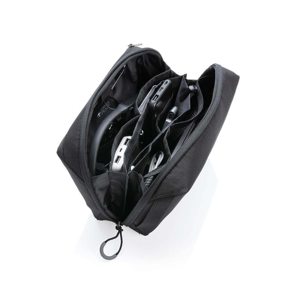 Na uchovanie nabíjacích káblov, elektroniky, cestovných potrieb, toaletných potrieb alebo akýchkoľvek každodenných vecí. Praktická taštička, ktorú využije skutočne každý. Origami vrecká poskytujú neuveriteľnú veľa úložného priestoru pri maximálnej miere organizácie. Elastické pútka na uchovanie drobností ako napríklad perá. Vonkajší popruh pre ľahký prenos a otváranie na zips umožňujúci široké otvorenie pre ľahký prístup. Vonkajšie vrecko na zips s priechodom na kábel pre ľahké nabíjanie. Vyrobené z recyklovaného polyesteru AWARE™. Na výrobu bolo využitých 8,5 500ml PET fliaš a bolo usporených 5,1 litrov vody. Z výťažku každého predaného kusu sú navyše prispené 2 % na podporu iniciatívy Water.org. Bez PVC.