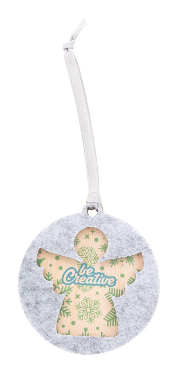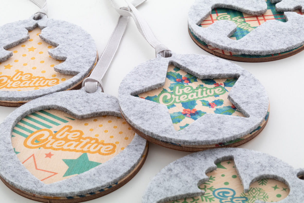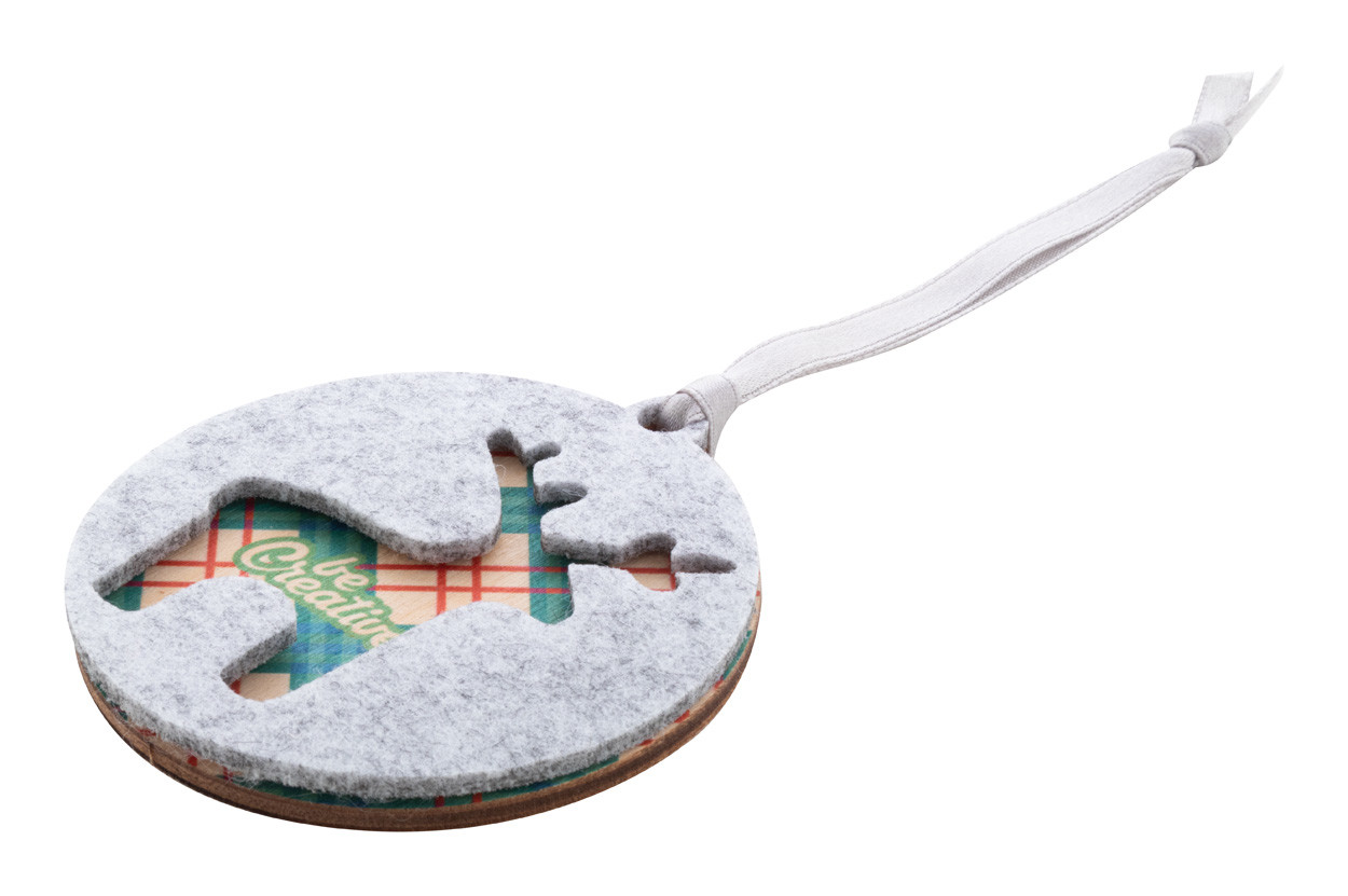Ozdoba na vianočný stromček z dvojvrstvovej RPET plsti a brezovej preglejky vyrobená na zákazku s celostriebornou stuhou a vysekávaným vianočným dizajnom na hornej vrstve. Cena zahŕňa UV LED potlač na spodnej vrstve, nezahŕňa tlačovú prípravu. Min. mn.: 100 ks.