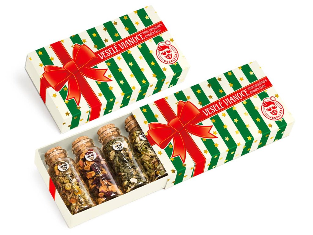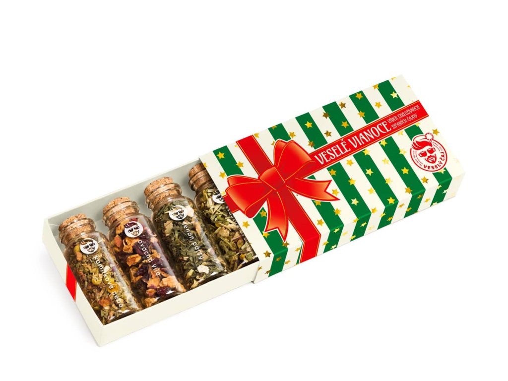 Vianočný šuflíček je darčekový set prémiových sypaných čajov, ktoré v sebe ukrývajú chuť a vôňu Vianoc. Každý čaj je balený v skle s korkom, krabička je pripravená rovno na darovanie.