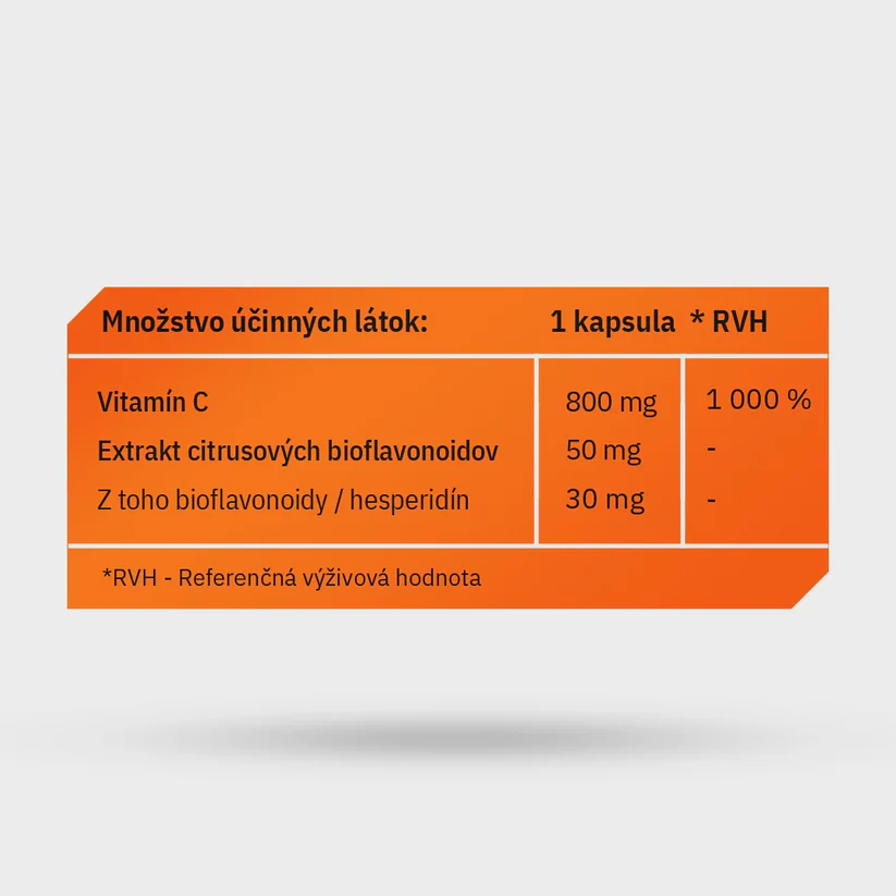 Vitamín C vo vysokej dávke prispieva k správnej funkcii imunitného systému, znižuje únavu a vyčerpanie, podporuje tvorbu kolagénu, chráni bunky pred oxidačným stresom a pomáha pri vstrebávaní železa. Je ideálny pri psychickej aj fyzickej záťaži, počas chrípkového obdobia, pri zvýšenej potrebe antioxidantov aj na rýchlejšiu regeneráciu organizmu. Zloženie: vitamín C (kyselina L-askorbová), bioflavonoidy, rastlinná kapsula (HPMC).