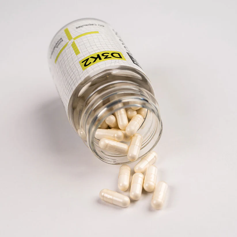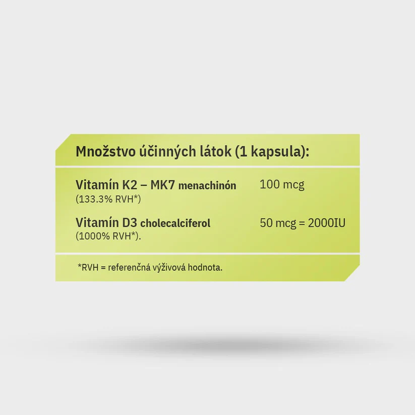 Prémiový výživový doplnok s kombináciou vitamínu D3 a K2, ktorý podporuje zdravie kostí, zubov, imunitného systému a prispieva k správnemu vstrebávaniu a využitiu vápnika. Vitamín D3 pomáha udržiavať normálnu hladinu vápnika v krvi a vitamín K2 zabezpečuje jeho správne uloženie v kostiach. Praktická forma kapsúl zaručuje pohodlné dávkovanie. Zloženie: vitamín K2-MK7 (menachinón), vitamín D3 (cholekalciferol), objemové činidlo: mikrokryštalická celulóza, kapsula vyrobená z hydroxypropyl metylcelulózy a vody.