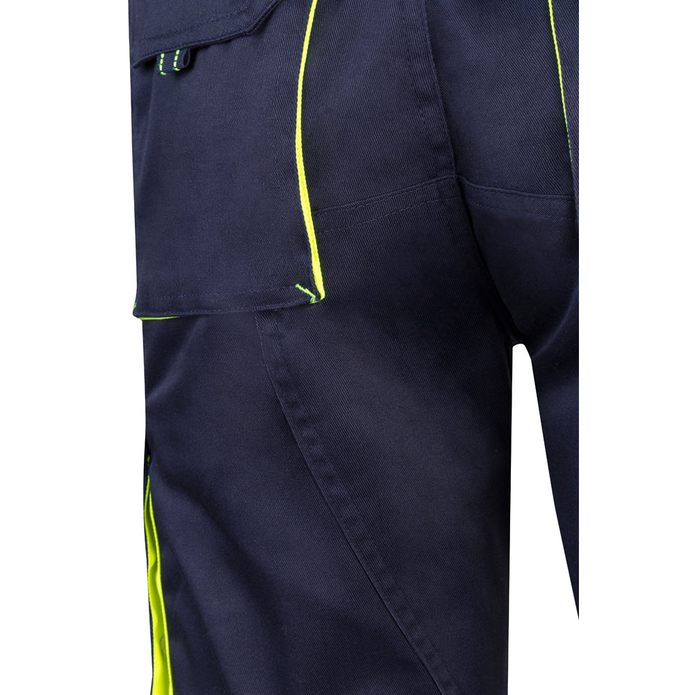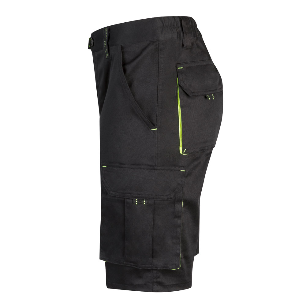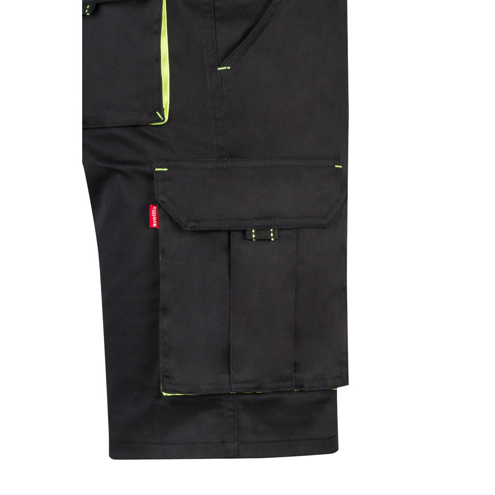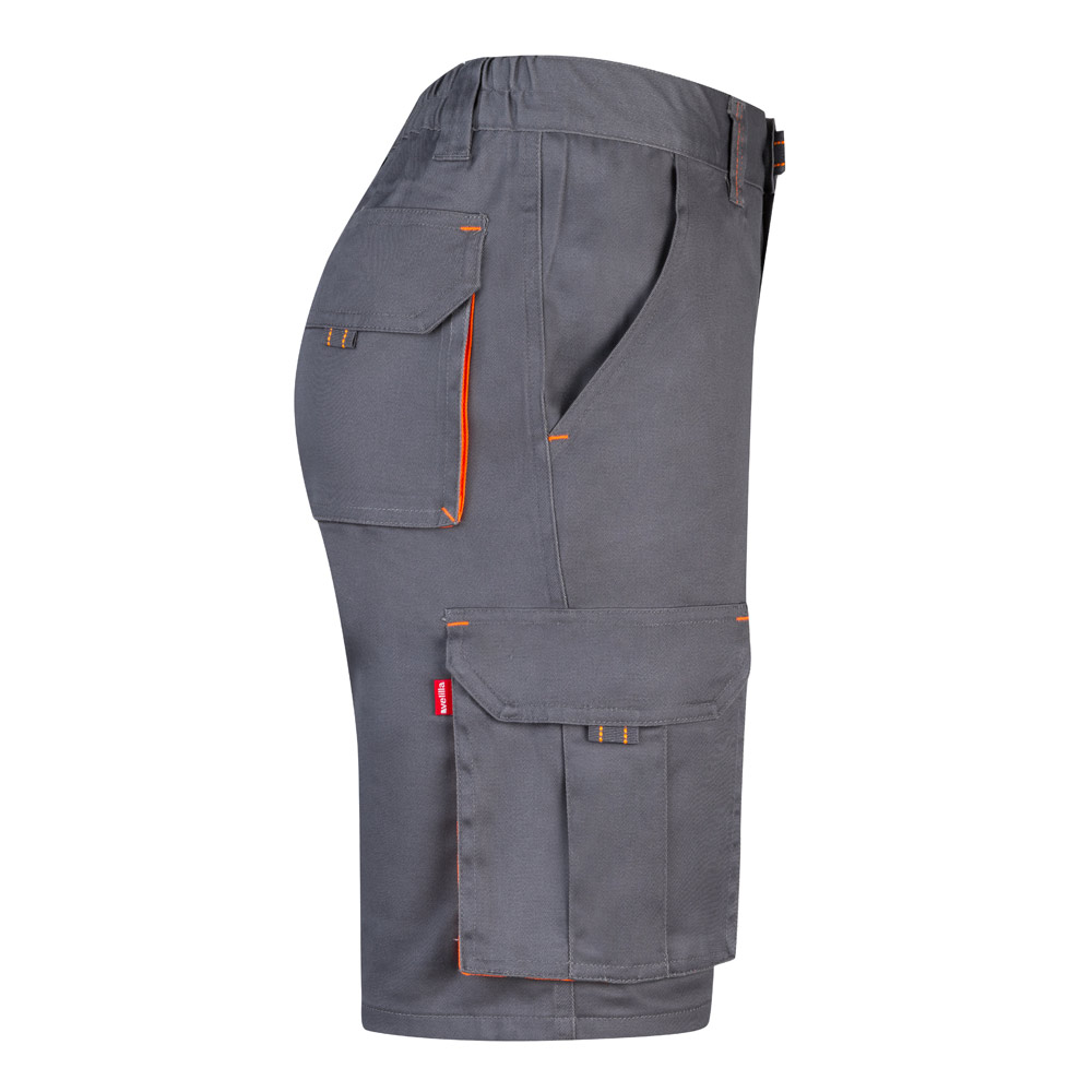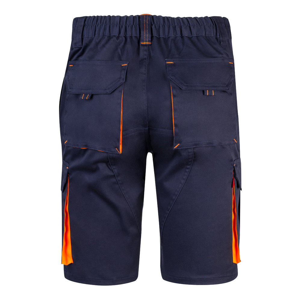 Dvojfarebné strečové bermudy s viacerými vreckami (240 g/m²) z bavlny (46 %), EME (38 %) a polyesteru (16 %). S elastickým pásom, kontrastnou farbou na klinoch, sťahovacím pútkom a prešívaním a látkovou výstužou vzadu. Obsahuje šesť vreciek (2 francúzske vrecká, 2 bočné klinové vrecká a 2 zadné klinové vrecká). Veľkosť: 34, 36, 38, 40, 42, 44, 46, 48, 50, 52, 54, 56, 58, 60