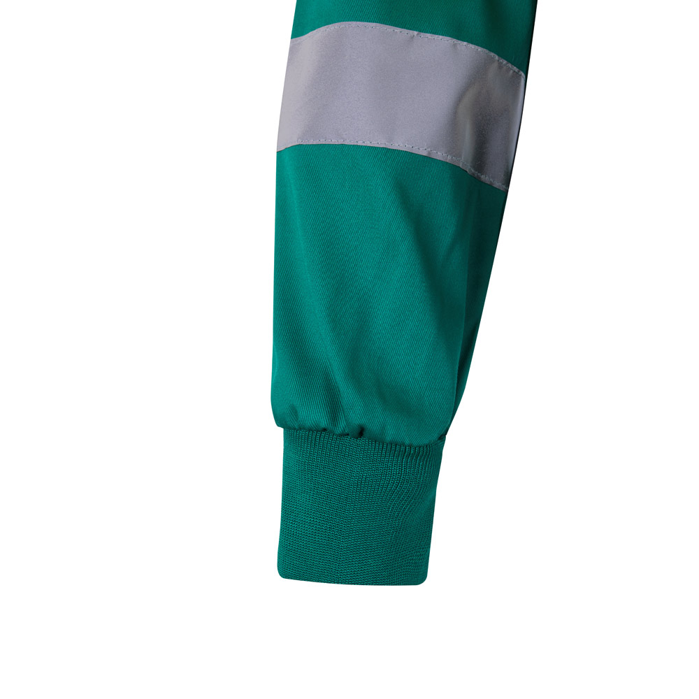 Dvojfarebná keprová bunda (210 g/m²) z polyesteru (80 %) a bavlny (20 %). Centrálny zips, elastický bočný pás a rebrované manžety. Reflexné pruhy na trupe a rukávoch a dve náprsné vrecká na zips. Výrobok v súlade s nariadením EÚ 2016/425, certifikovaný podľa normy EN20471 a triedy 2. Veľkosť: S, M, L, XL, 2XL, 3XL