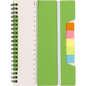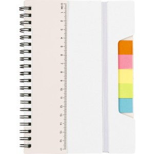 Poznámkový blok s pravítkom (17 cm) a lepivými poznámkami. 60 strán je orámovaných. Päť farieb poznámok s 25 poznámkami na farbu. Elastický pásik uzatvára notebook., PP, papier 700 g / m2, papier 70 g / m2