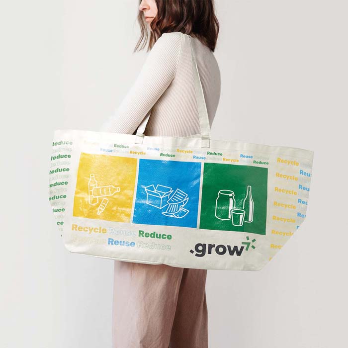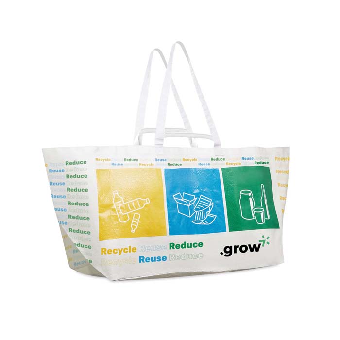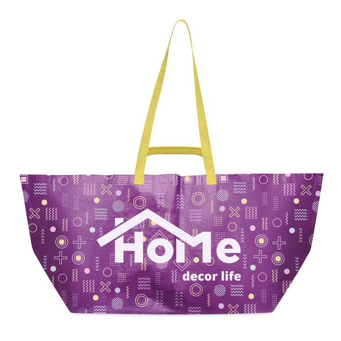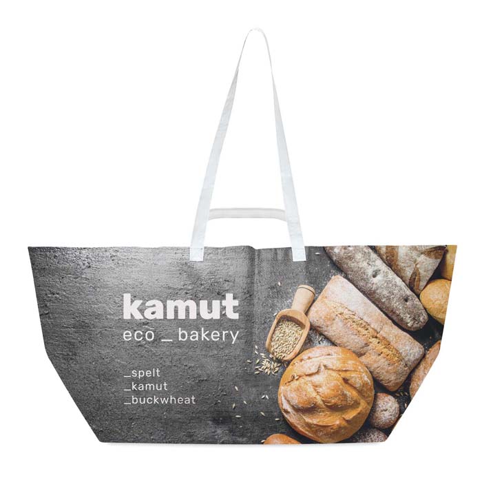 Horizontálna nákupná taška s dvojitými vlastnými rúčkami (dĺžka: 30+70 cm, šírka: 2,5 cm). Rozmery tašky: 90x38x35cm; rozmer základne: 35 x 55 cm. PP-tkaná textília s lamináciou 140 g/m2.