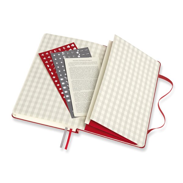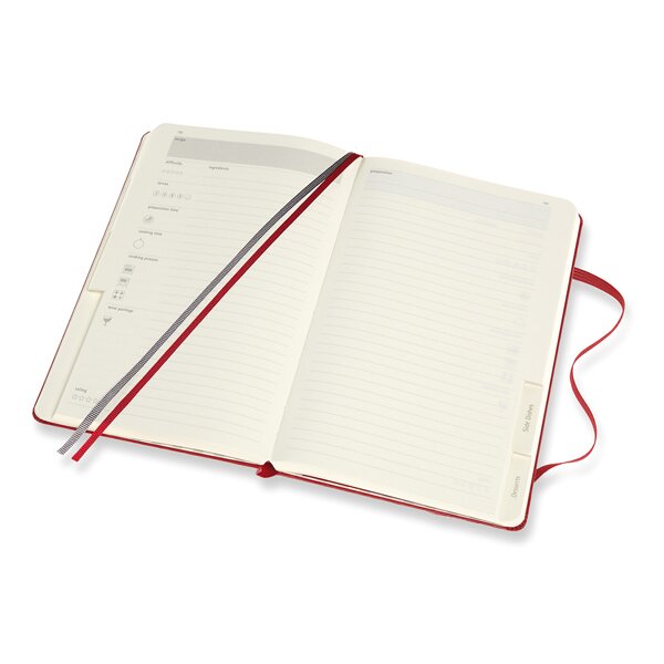 Zápisník s pevnou, v chrbte šitou väzbou v kartónových doskách s reliéfnym zdobením. Obopína ho pružná gumička proti samovoľnému otváraniu. Zápisník je vybavený 2 textilnými záložkami, dvojitým vnútorným vreckom, farebnými samolepkami a letákom s históriou MOLESKINE. Zápisník je rotulený do tematických sekcií pomocou záložiek. Zápisník je rotulený do 6 tematických sekcií so špecifickým rozvrhnutím strán (predjedlá, prvé chody, hlavné jedlá, prílohy, dezerty, koktejly), obsahuje informácie pre správne varenie (kalendár potravín, nutričné hodnoty, druhy panvíc, metódy varenia, teploty mäsa, prevod jednotiek atď.) aj prázdne strany
