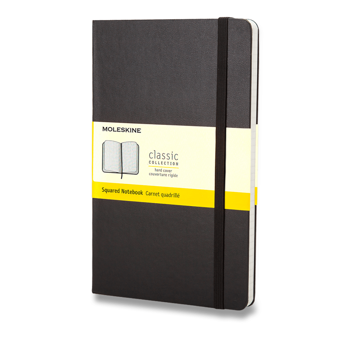 Zápisník s pevnou, v chrbte šitou väzbou v kartónových doskách, obopnutý pružnou páskou proti samovoľnému otváraniu. Zápisník je vybavený vreckom na vizitky a drobnosti, ktoré je vyrobené z tkaniny a kartónu, textilnou záložkou a letákom s históriou MOLESKINE. Gramáž papiera 70 g/m2, neobsahuje kyseliny.