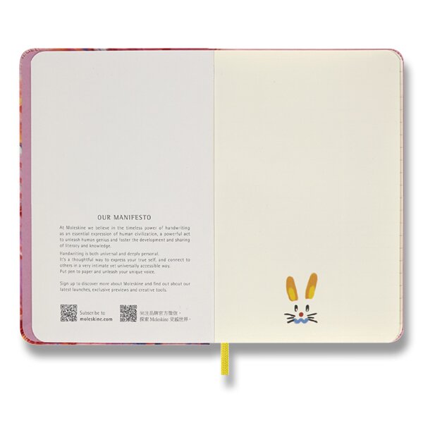 Zápisník Moleskine Year Of The Rabbit od návrhárky Angel Chen z limitovanej edície Asian Cellection 2023 má pevnú, v chrbte šitú väzbu v kartónových doskách obopnutých pružnou gumičkou proti samovoľnému otváraniu. Zápisník je vybavený vreckom na vizitky a drobnosti, textilnou záložkou, samolepkami, dvoma obálkami a letákom s príbehom projektu od MOLESKINE.