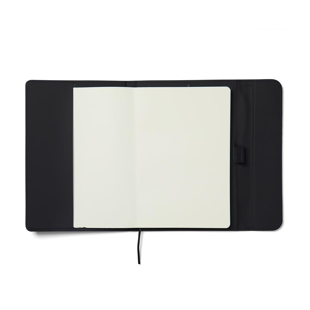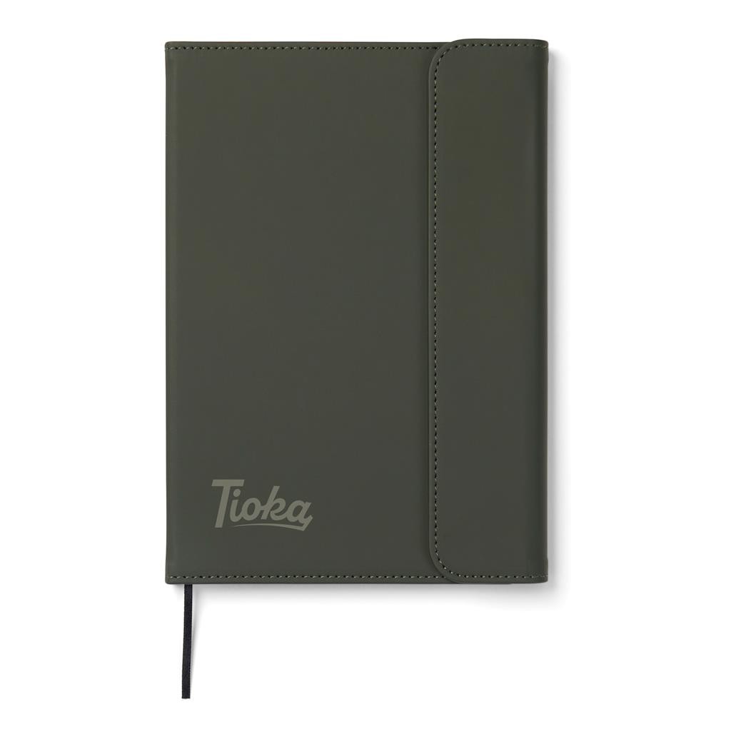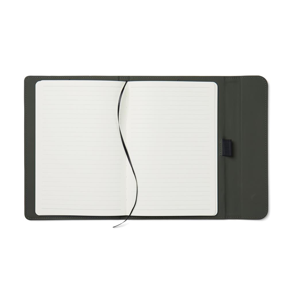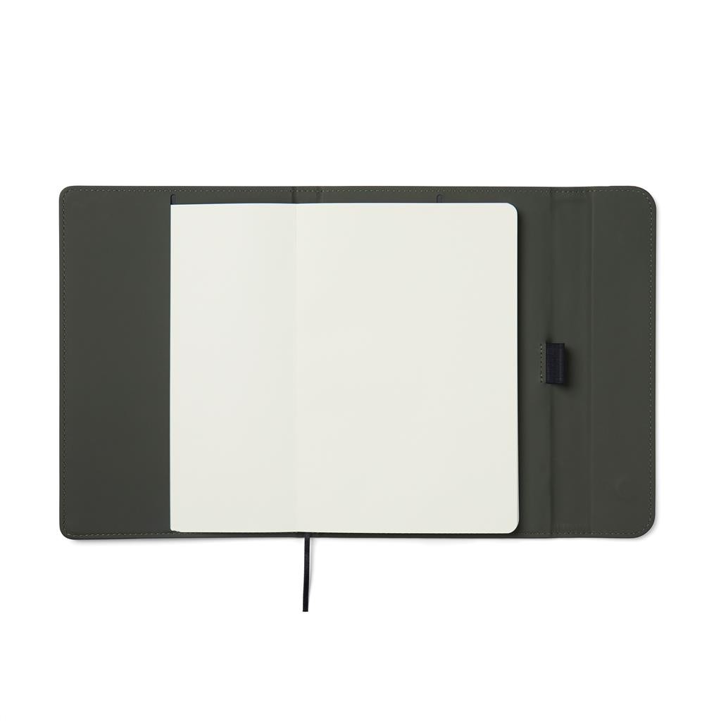 Štýlový obal na zápisník z matného z recyklovaného PU. Magnetické zatváranie, integrovaný držiak na pero. Obsahuje vymeniteľný zápisník s 80 listami/160 stranami linkovaného recyklovaného papiera (70g/m2). Vyrobené z GRS recyklovaných materiálov. GRS (Global Recycle Standard) je globálny štandard, ktorý umožňuje overiť použitie recyklovaného materiálu v produkte naprieč celým dodávateľským reťazcom. Celkový podiel recyklátu podľa váhy produktu: 54% (zápisník) a 18% (obal).