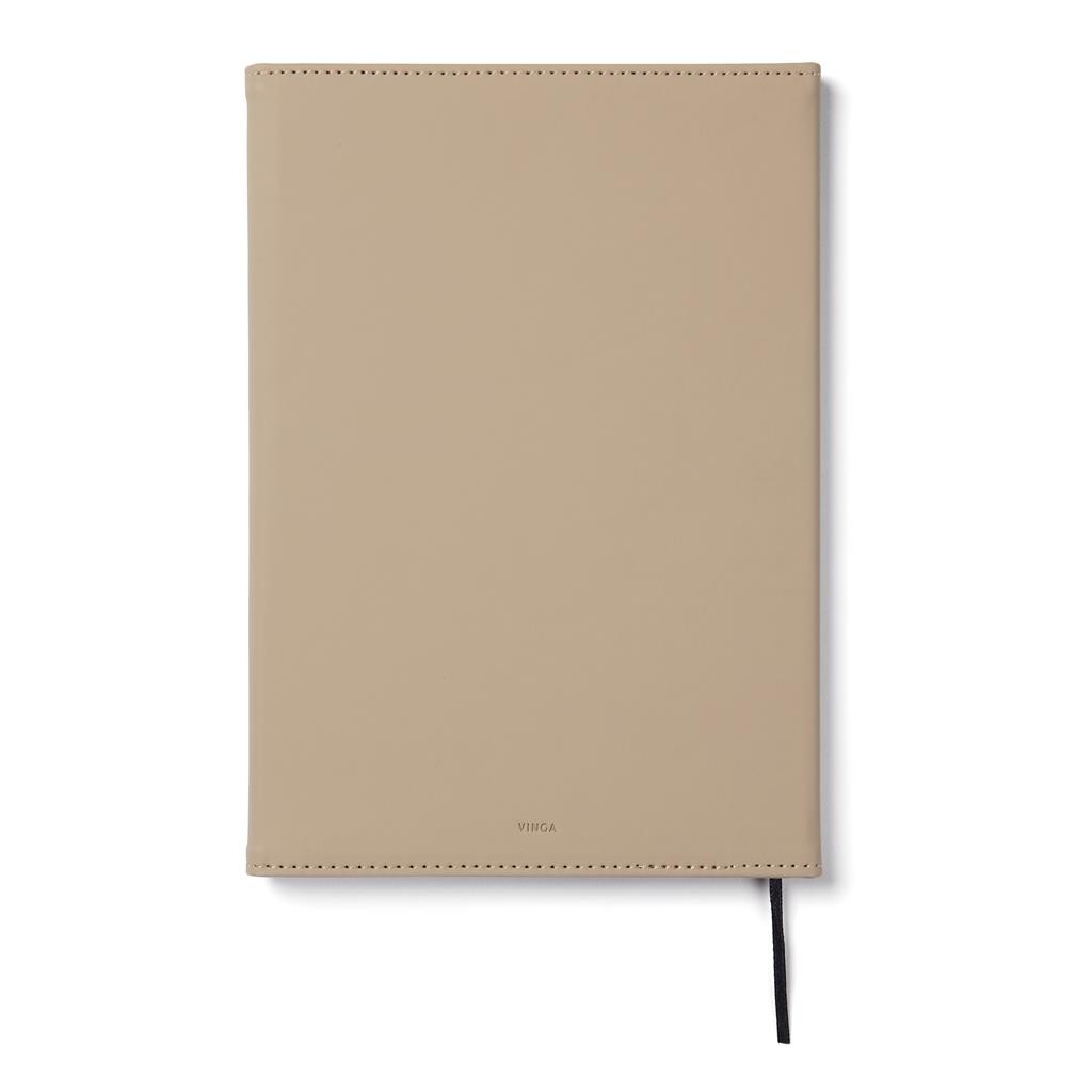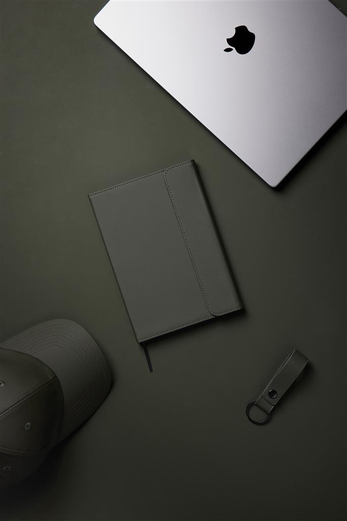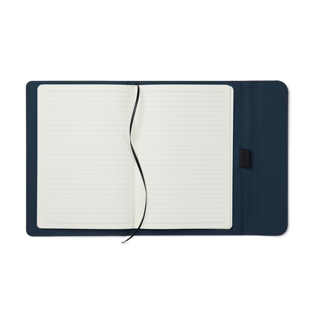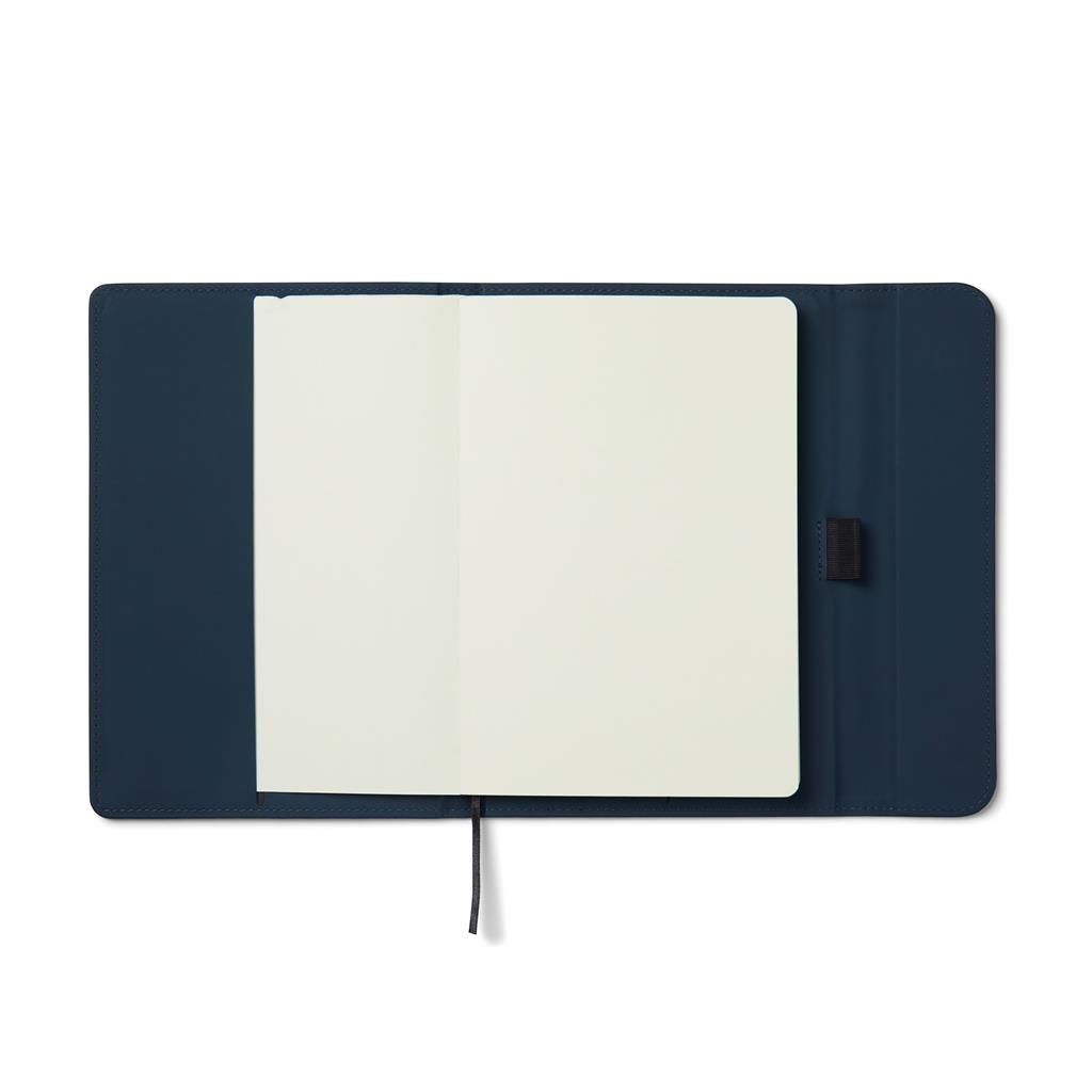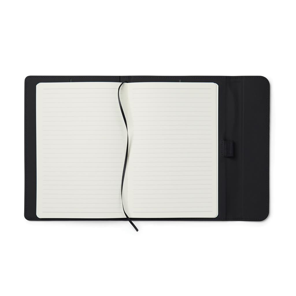 Štýlový obal na zápisník z matného z recyklovaného PU. Magnetické zatváranie, integrovaný držiak na pero. Obsahuje vymeniteľný zápisník s 80 listami/160 stranami linkovaného recyklovaného papiera (70g/m2). Vyrobené z GRS recyklovaných materiálov. GRS (Global Recycle Standard) je globálny štandard, ktorý umožňuje overiť použitie recyklovaného materiálu v produkte naprieč celým dodávateľským reťazcom. Celkový podiel recyklátu podľa váhy produktu: 54% (zápisník) a 18% (obal).