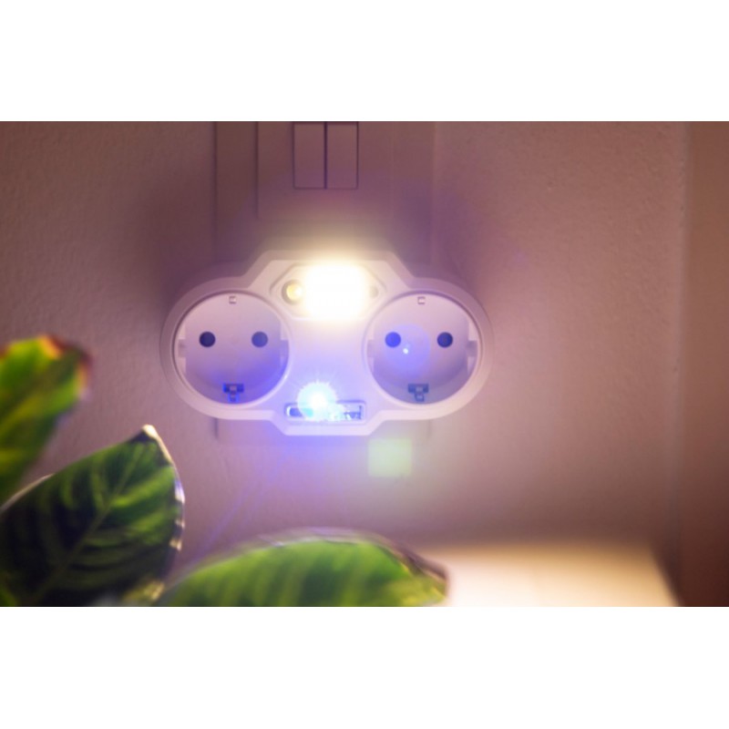 Zásuvkový napájací adaptér USB s nočným svetlom ENDLESS POWER NIGHT: 2 uzemnené zásuvky Schuko s detskou poistkou, 1 port USB-A, 1 port USB-C, celkový výstupný výkon USB: max. 3,4 A, výstupný výkon Schuko zásuvky max. 3,250 W, nočné svetlo so senzorom a vypínačom, modrá stavová LED, nevhodné pre UK.